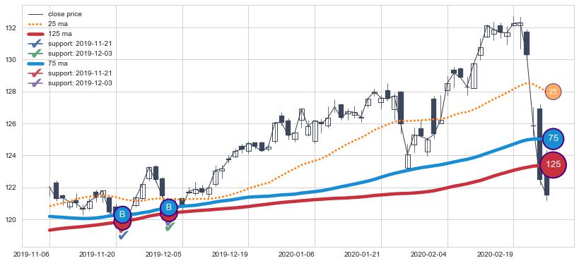 上涨趋势2019-11-06-2020-02-26,均线75, 125确认关键支撑2处
