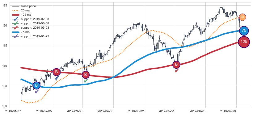 上涨趋势2019-01-07-2019-07-31,均线75, 125确认关键支撑4处