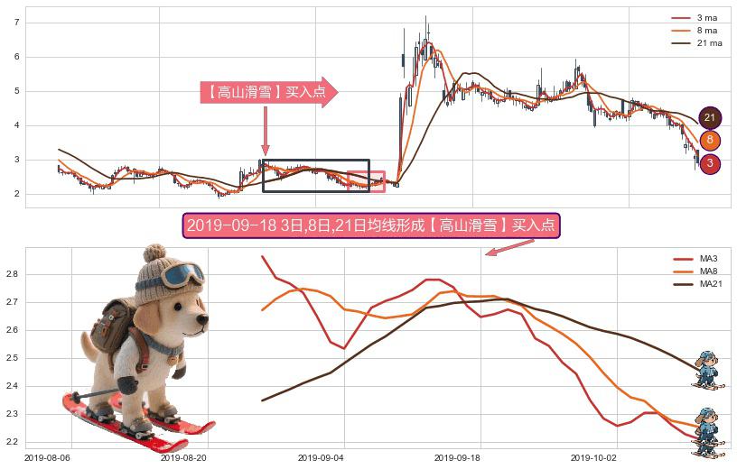 形态多维评估: ⚀ 2019-08-26日-2019-10-10日显现 3日-8日-21日均线 【高山滑雪】买入点 看多信号,后市看涨,买入