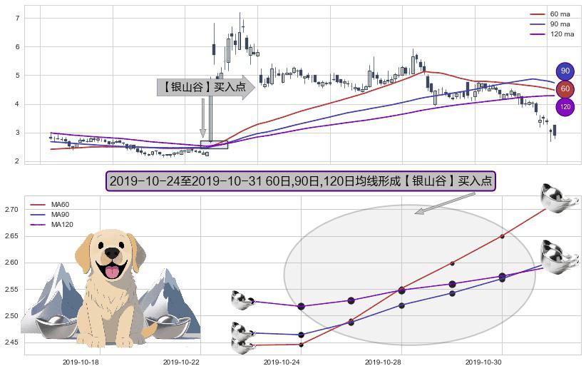 形态多维评估: ⚀ 2019-10-25-日至2019-10-31-日显现 60日-90日-120日均线 【银山谷】买入点 看多信号,后市看涨,买入