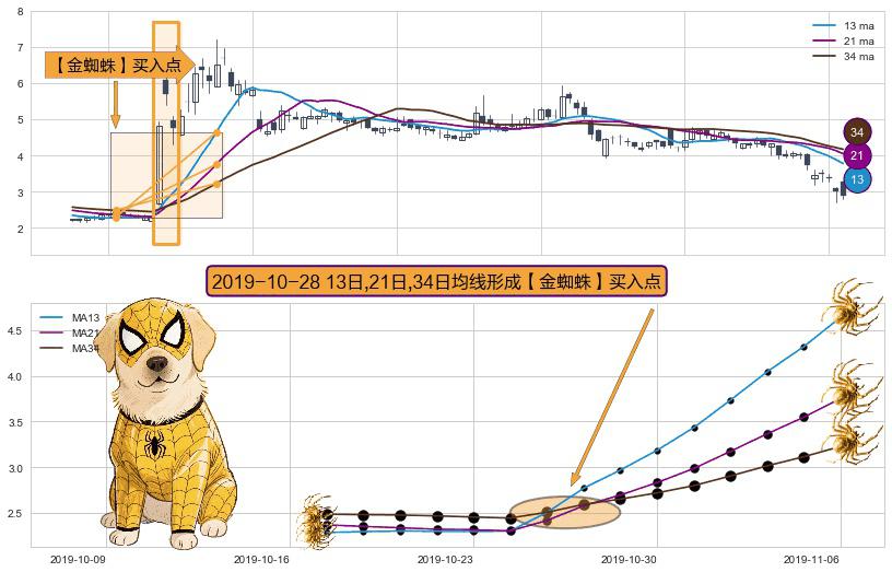 形态多维评估: ⚀ 2019-10-28日显现 13日-21日-34日均线 【金蜘蛛】买入点 看多信号,后市看涨,买入