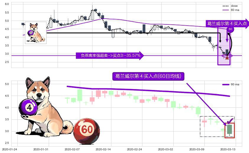 形态多维评估: ⚀ 2020-03-13-日显现 葛兰威尔均线 60日均线 第④买入点 下降趋势均值回复的短线反弹信号,后市看涨,买进信号