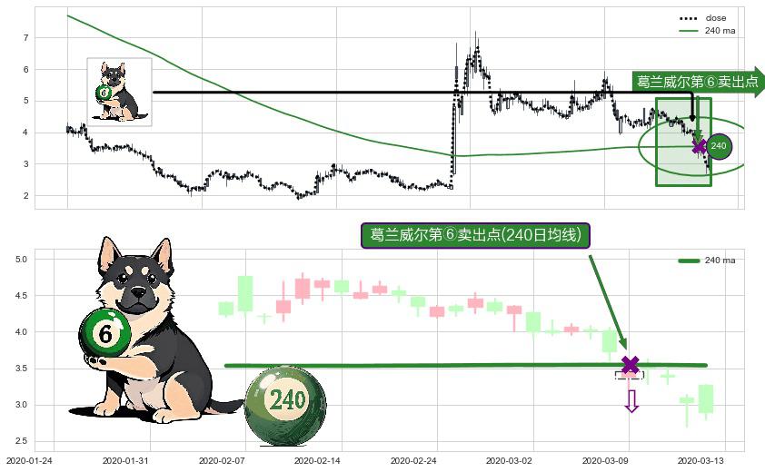 形态多维评估: ⚀ 2020-03-09-日显现 葛兰威尔均线 240日均线 第⑥卖出点 走势反转见顶信号,后市看跌,卖出信号