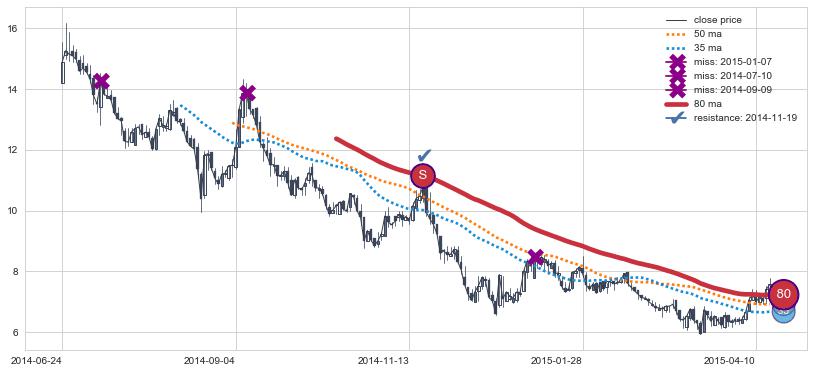 下跌趋势2014-06-24-2015-04-16,均线80确认关键阻力1处