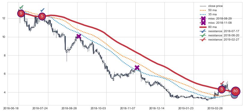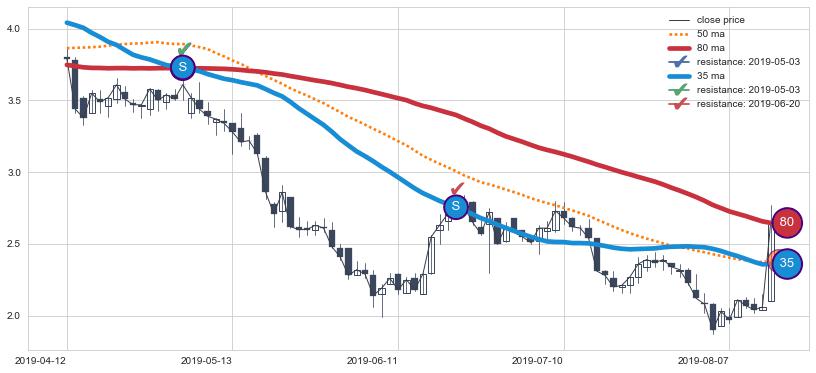 下跌趋势2019-04-12-2019-08-14,均线80, 35确认关键阻力2处