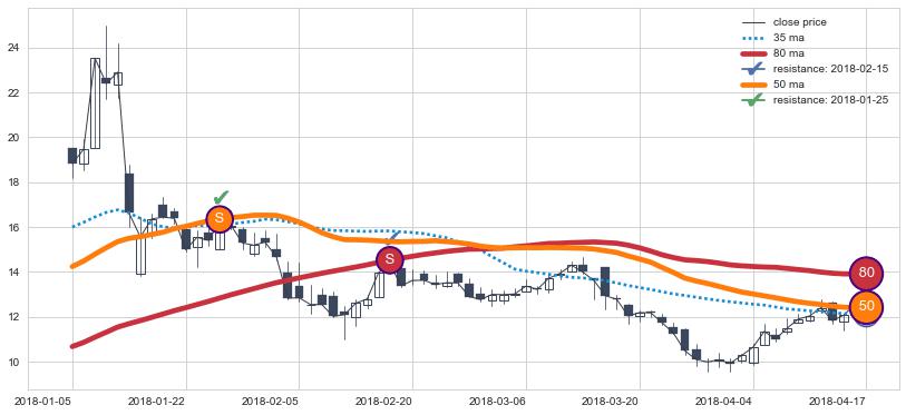 下跌趋势2018-01-05-2018-04-17,均线80, 50确认关键阻力2处