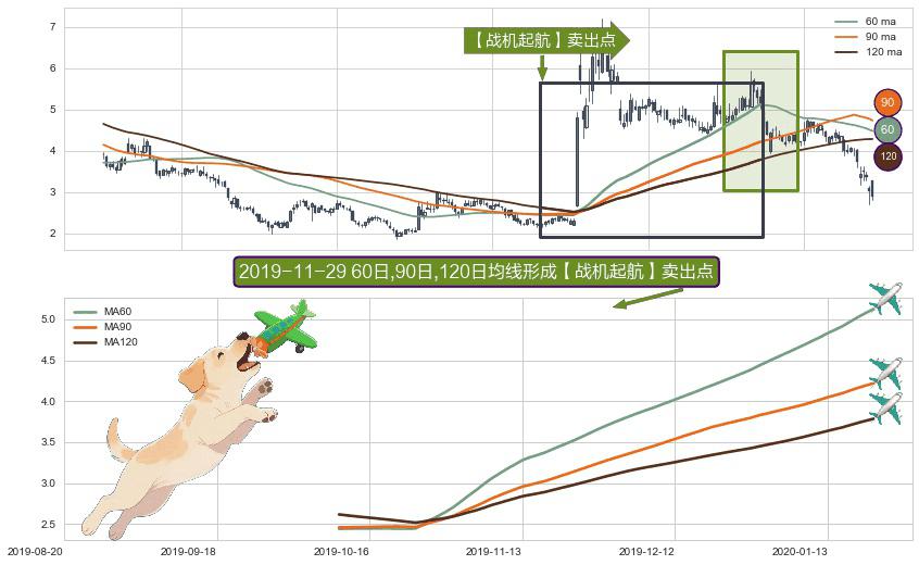 形态多维评估: ⚀ 2019-10-10日-2020-01-22日显现 60日-90日-120日均线 【战机起航】卖出点 看空信号,后市看跌,卖出