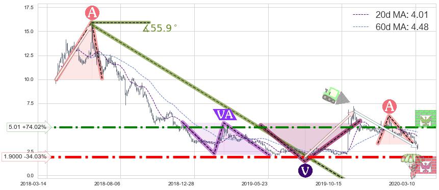 ♘ 阻力价格位5.01,可信任强度73.42%,距离最后交易2020-03-13形成的收盘价格2.880相差 +74.02%