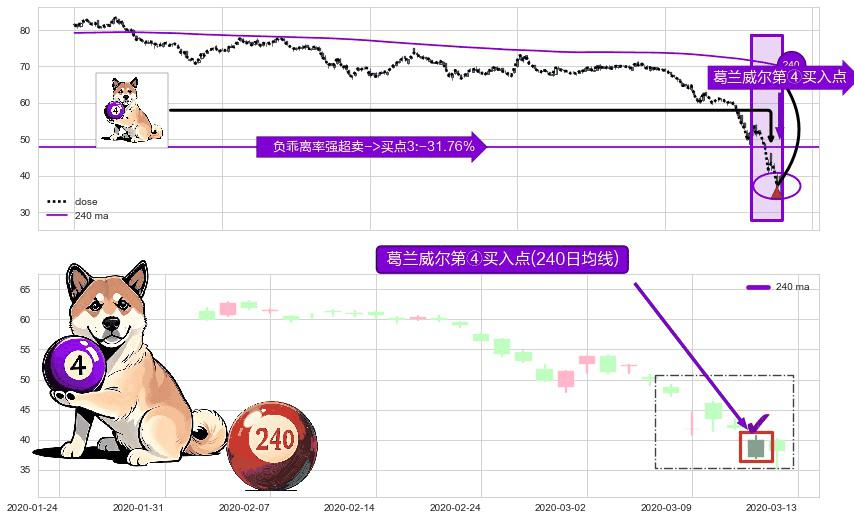 形态多维评估: ⚀ 2020-03-12-日显现 葛兰威尔均线 240日均线 第④买入点 下降趋势均值回复的短线反弹信号,后市看涨,买进信号