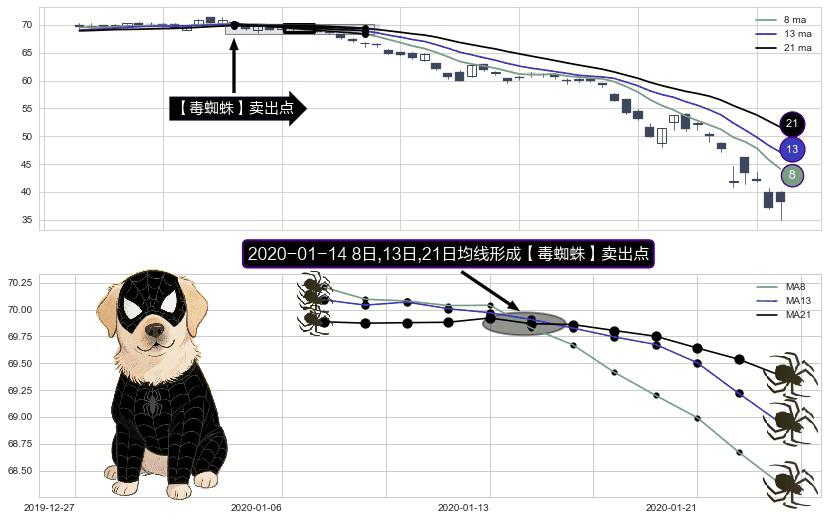 形态多维评估: ⚀ 2020-01-14日显现 8日-13日-21日均线 【毒蜘蛛】卖出点 看空信号,后市看跌,卖出