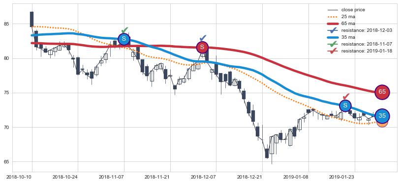 下跌趋势2018-10-10-2019-01-30,均线65, 35确认关键阻力3处