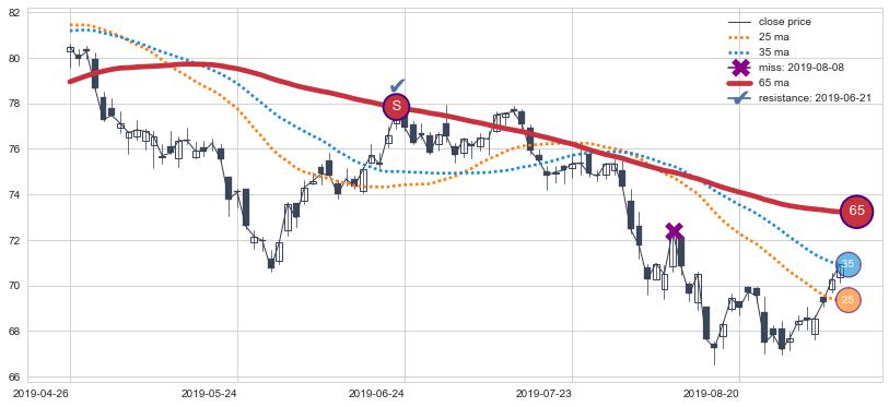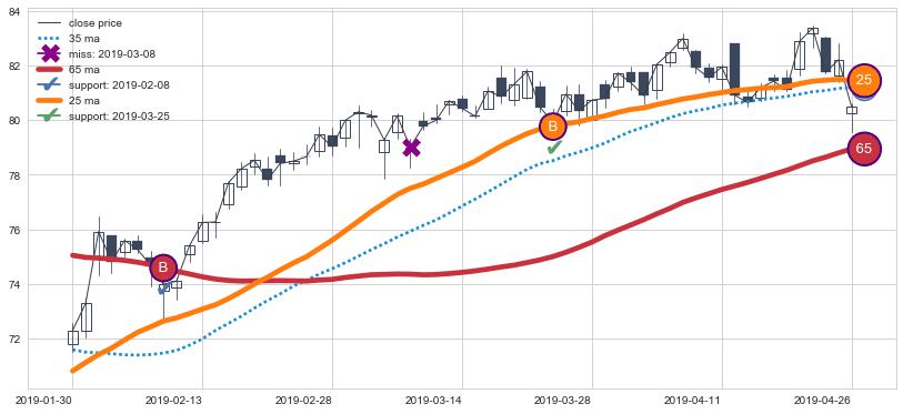 上涨趋势2019-01-30-2019-04-26,均线65, 25确认关键支撑2处