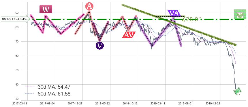 ♘ 阻力价格位85.48,可信任强度99.00%,距离最后交易2020-03-13形成的收盘价格38.12相差 +124.24%