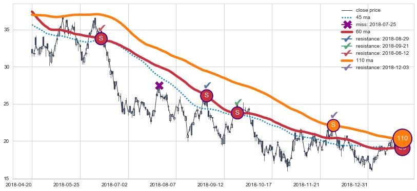 下跌趋势2018-04-20-2019-01-22,均线60, 110确认关键阻力4处