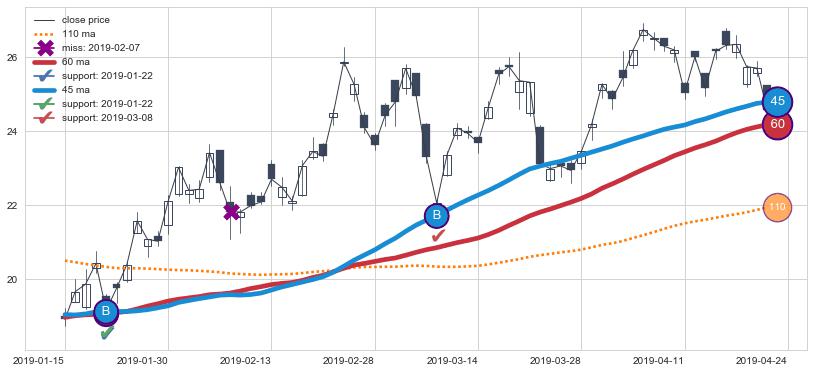 上涨趋势2019-01-15-2019-04-24,均线60, 45确认关键支撑2处