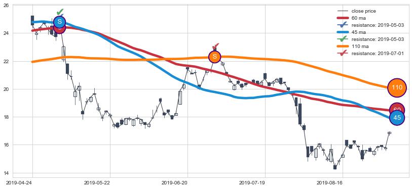 下跌趋势2019-04-24-2019-09-04,均线60, 45, 110确认关键阻力2处