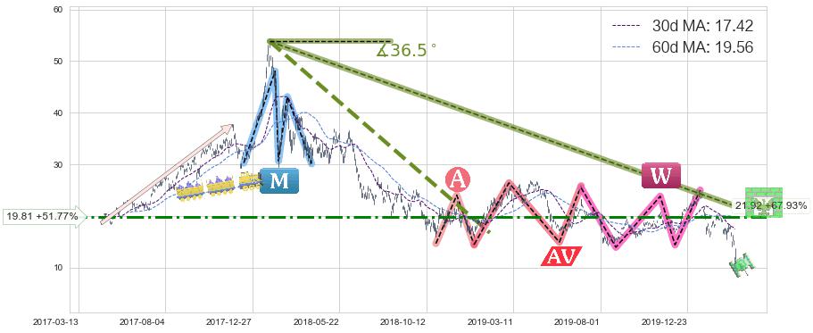 从2018-01-26至2020-03-13,共包含536个交易日,阶段股价下跌-92.09%,阶段股价变动位移路程比: 1 : 18,下跌趋势角度: 36.5