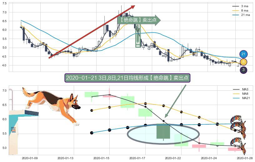 形态多维评估: ⚀ 2020-01-21日显现 3日-8日-21日均线 【绝命跳】卖出点 看空信号,后市看跌,卖出