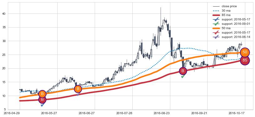 上涨趋势2016-04-29-2016-10-17,均线50, 85确认关键支撑3处