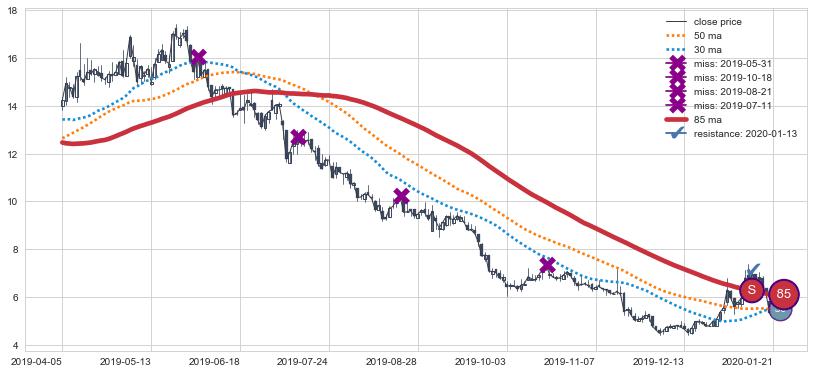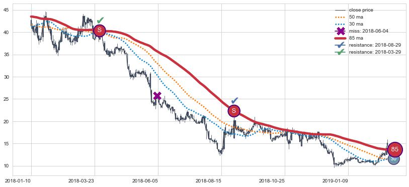 下跌趋势2018-01-10-2019-02-25,均线85确认关键阻力2处