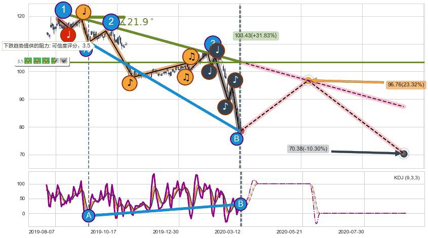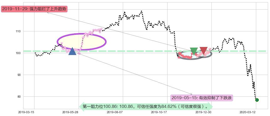 ♘ 在最后的下跌阶段2019-08-09至2020-03-13,存在 持续未破位的阻力位 ,阻力价格103.43,可信任强度80.76%,其距离最后价格78.46相差 +31.83%