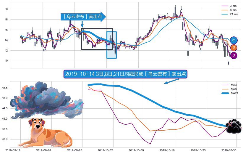 ⚀ 2019-09-26日-2019-10-29日显现 3日-8日-21日均线 【乌云密布】卖出点 看空信号,后市看跌,卖出