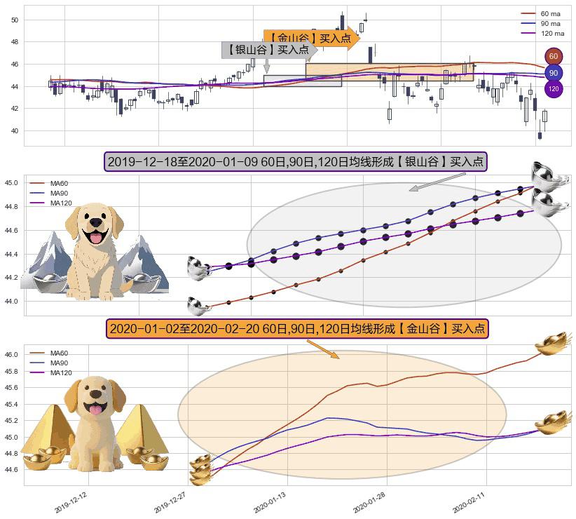 ⚃ 2020-01-03-日至2020-02-20-日显现 60日-90日-120日均线 【金山谷】买入点 其再次确认了买入信号,可靠性更强,买入