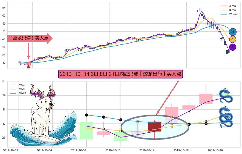 形态多维评估: ⚀ 2019-10-14日显现 3日-8日-21日均线 【蛟龙出海】买入点 看多信号,后市看涨,买入