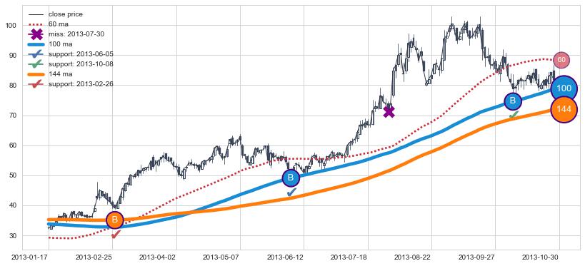 上涨趋势2013-01-17-2013-10-30,均线144, 100确认关键支撑3处