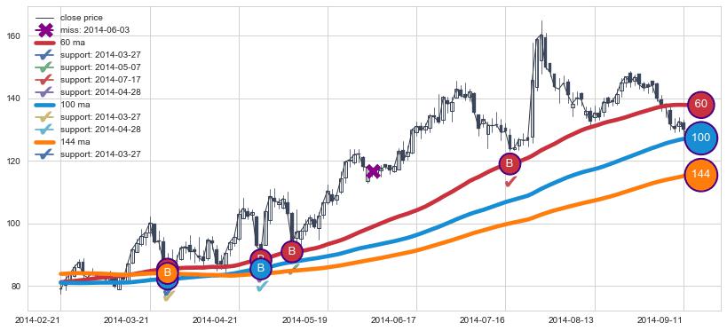 上涨趋势2014-02-21-2014-09-12,均线100, 60, 144确认关键支撑4处