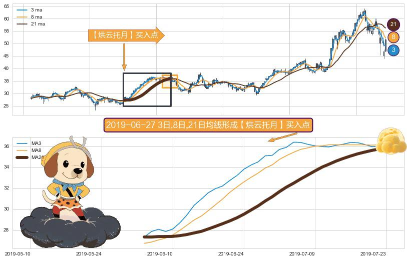 ⚀ 2019-06-04日-2019-07-23日显现 3日-8日-21日均线 【烘云托月】买入点 看多信号,后市看涨,买入
