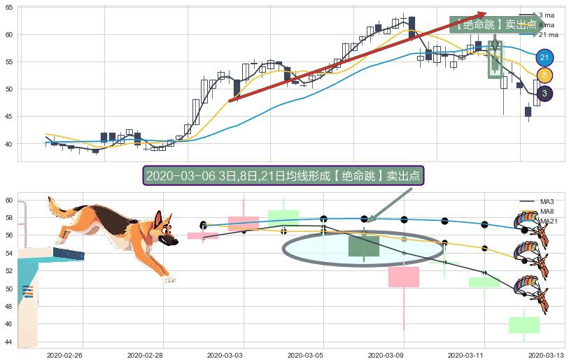 ⚀ 2020-03-06日显现 3日-8日-21日均线 【绝命跳】卖出点 看空信号,后市看跌,卖出