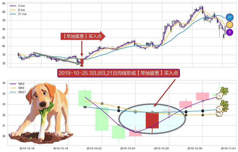 ⚀ 2019-10-25日显现 3日-8日-21日均线 【旱地拔葱】买入点 看多信号,后市看涨,买入