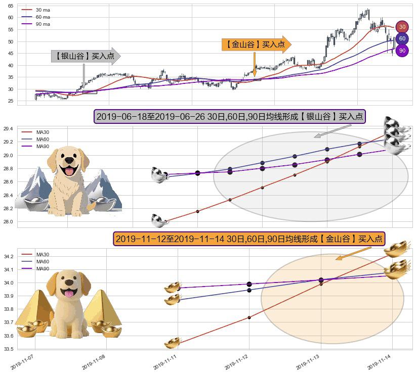 ⚀ 2019-11-13-日至2019-11-14-日显现 30日-60日-90日均线 【金山谷】买入点 其再次确认了买入信号,可靠性更强,买入