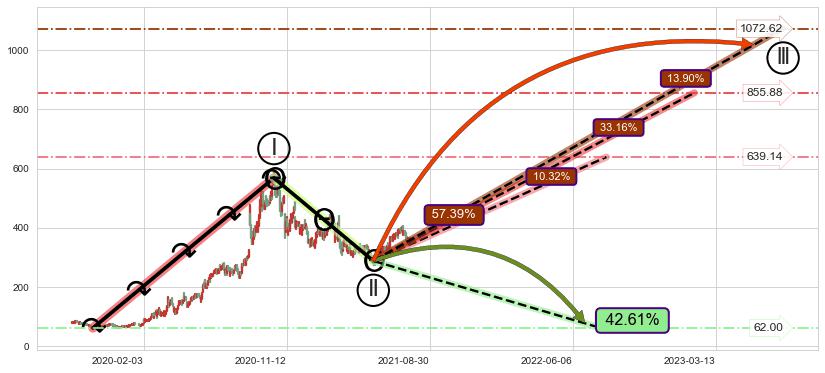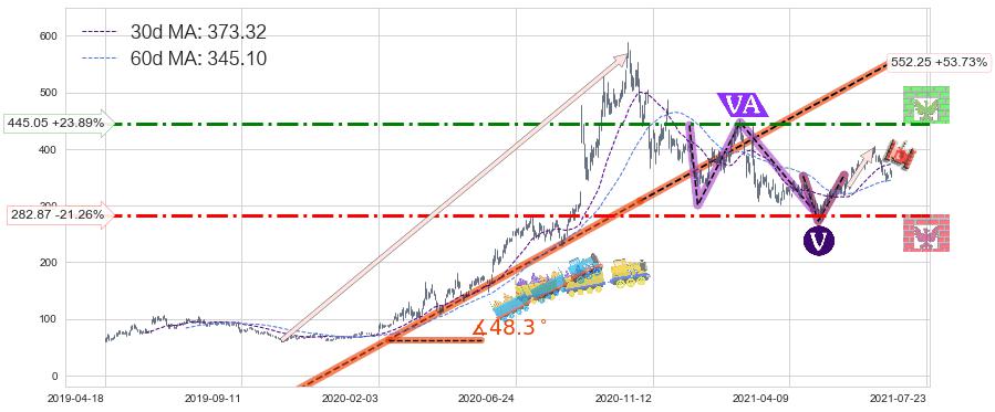 ♘ 支撑价格位282.87,可信任强度69.38%,距离最后交易2021-07-23形成的收盘价格359.23相差 -21.26%