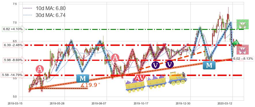 ♘ 支撑价格位5.98,可信任强度77.59%,距离最后交易2020-03-13形成的收盘价格6.55相差 -8.69%
