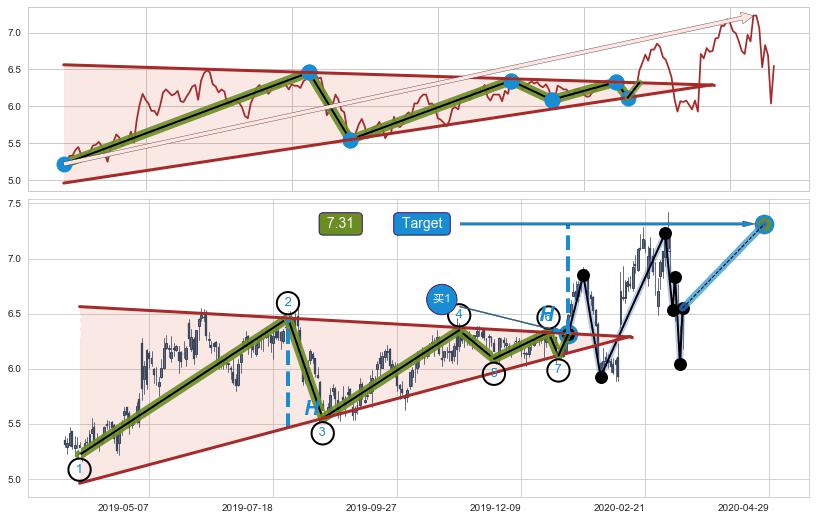 ➣ 【多空双方观望→争持→促使价格波动日益狭窄→多方打破攻守平衡点】对称三角形中继整理, 已在2020-01-07突破【阻力】颈线 6.32 →演变成上升通道