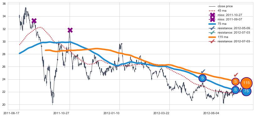 下跌趋势2011-08-17-2012-07-12,均线115, 75确认关键阻力2处