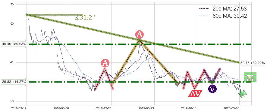 从2018-03-14至2020-03-13,共包含504个交易日,阶段股价下跌-69.81%,阶段股价变动位移路程比: 1 : 15,下跌趋势角度: 31.2