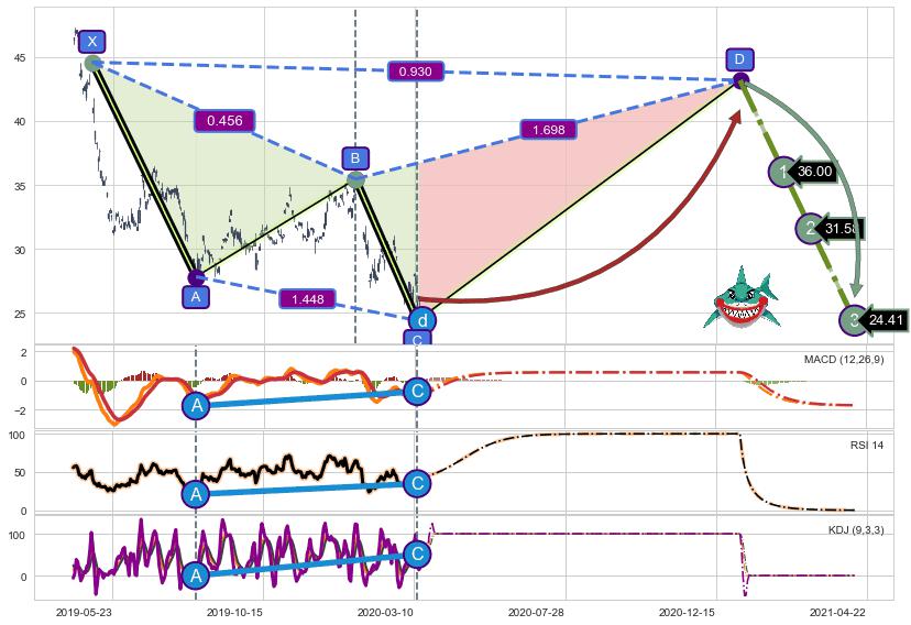 ➣ D点拟合预测价格43.17,距离最后交易收盘价格26.10相差 +65.40%