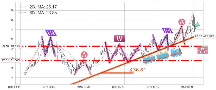♘ 支撑价格位20.55,可信任强度94.16%,距离最后交易2020-03-13形成的收盘价格25.60相差 -19.74%
