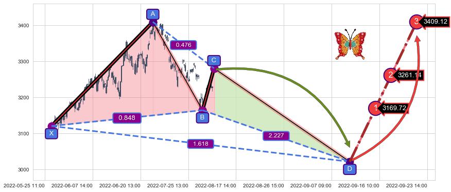 ➢ 未完成【蝴蝶】形态起点X: 03-03:09, 已到达C点: 08-03:14, 预测最终D点: 11-01:12, 共893交易小时