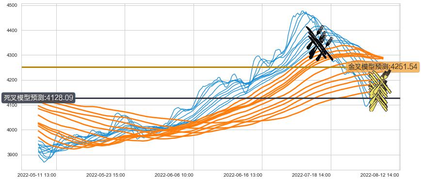 ➢ 45小时均线于(07-08 14:00: 4369.79)形成【死叉】基于【死叉历史模型】预测死叉后最低波谷价格: 4194.86, 死叉后最低价格4067.16,已经下跌超出预测最低波谷价格, 预期反弹