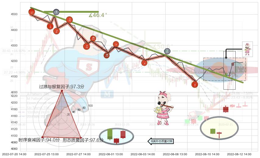从2022-06-30 13:00至2022-08-11 13:00,共包含61个小时,阶段股价下跌-6.98%,阶段股价变动位移路程比: 1 : 4,下跌趋势角度: 46.4