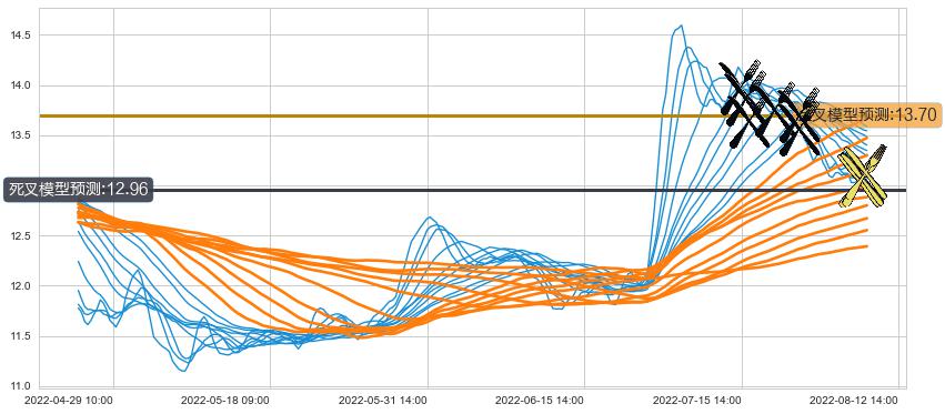 ➣ 45小时均线于(07-22 14:00: 13.74)形成【死叉】基于【死叉历史模型】预测死叉后最低波谷价格: 13.06, 死叉后最低价格12.88,已经下跌超出预测最低波谷价格, 预期反弹