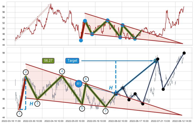 ➢ 最小中继整理涨幅→𝐇: 7.10 (𝐇楔型旗杆的长度:楔型起点→顶点)