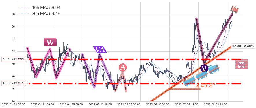 ♘ 支撑价格位50.70,可信任强度89.93%,距离最后交易2022-08-12 14:00形成的收盘价格58.00相差 -12.59%