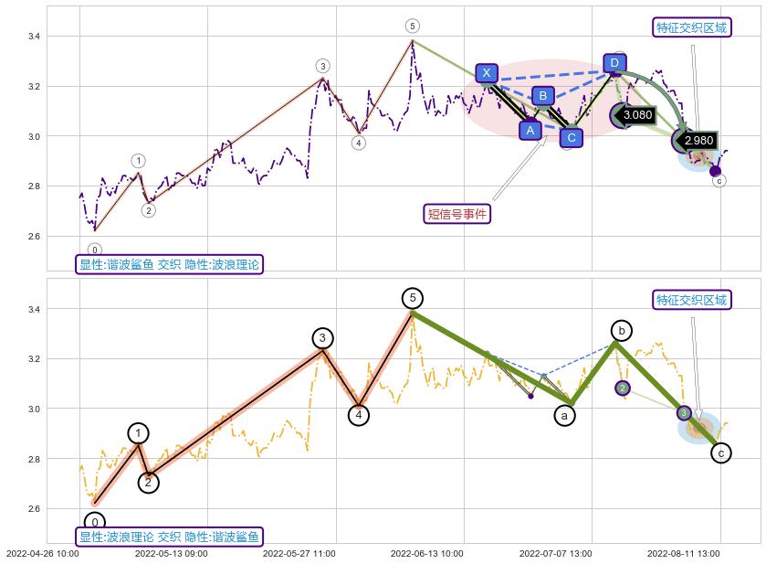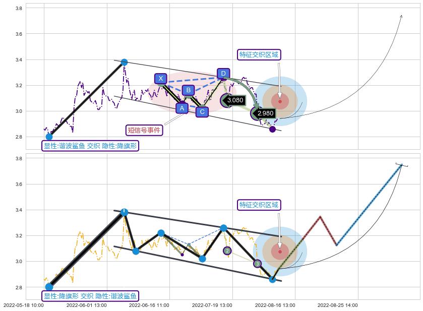 从2022-07-25 13:00至2022-08-12 14:00,共包含30个小时,阶段股价下跌-9.82%,阶段股价变动位移路程比: 1 : 2,2022-08-02 13:00向↘︎形成缺口,跳空下跌-4.79%˚