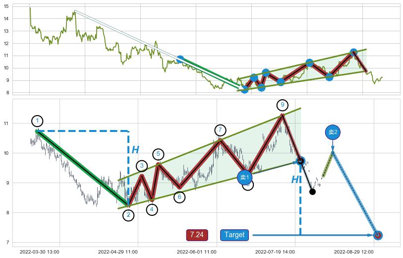 ➣ D点拟合预测价格12.36,距离最后交易收盘价格9.23相差 +33.94%