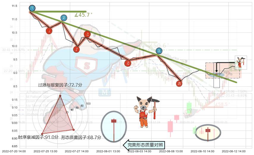 ➢ 2022-07-07 14:00-2022-08-11 14:00下跌趋势存在反转上涨[机会],其原下跌趋势的阻力位(8.64)已被突破[强支撑信号],原下跌趋势角度: 45.7˚